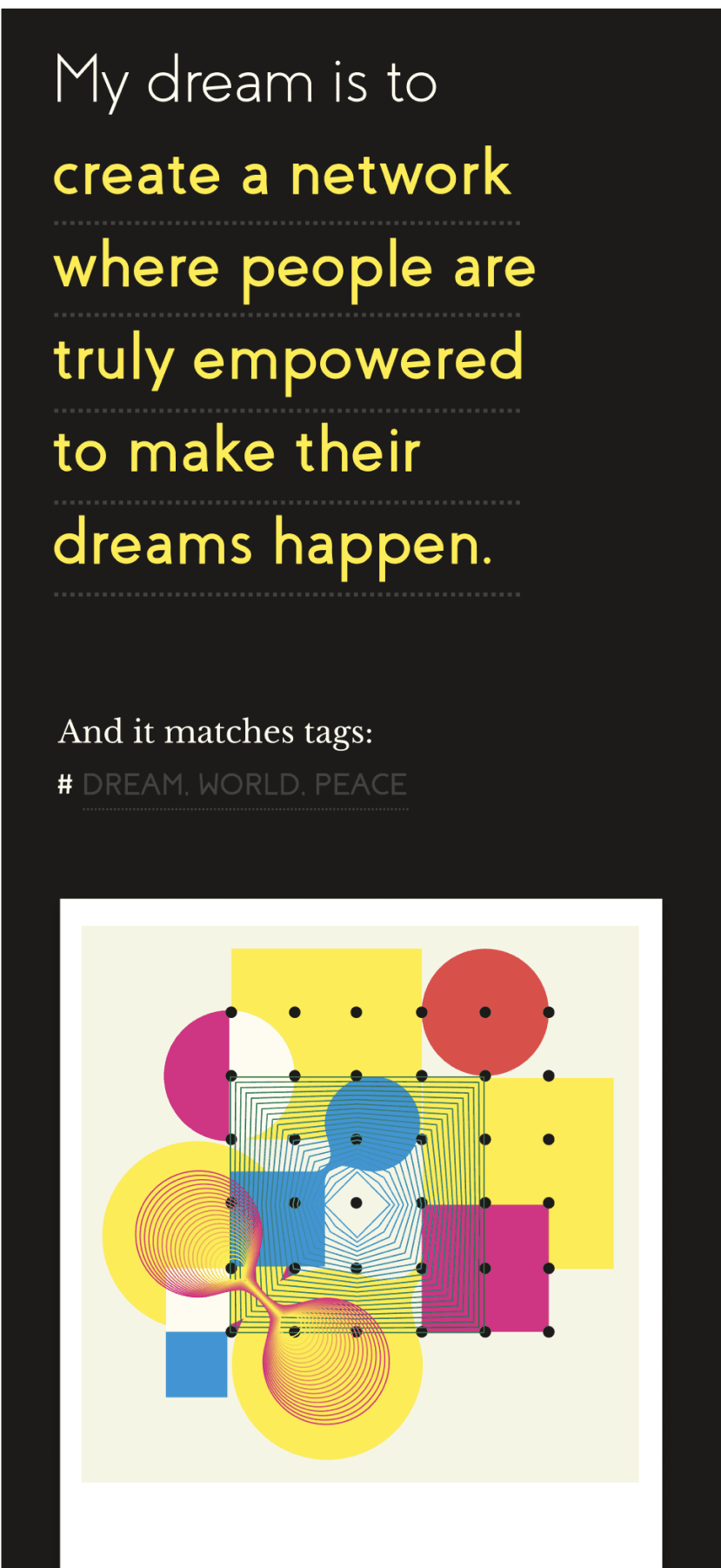 We kept the overall system simply and highly usable, to focus the experience on the sharing of the dreams, data correlation of information and generation of the unique artwork.